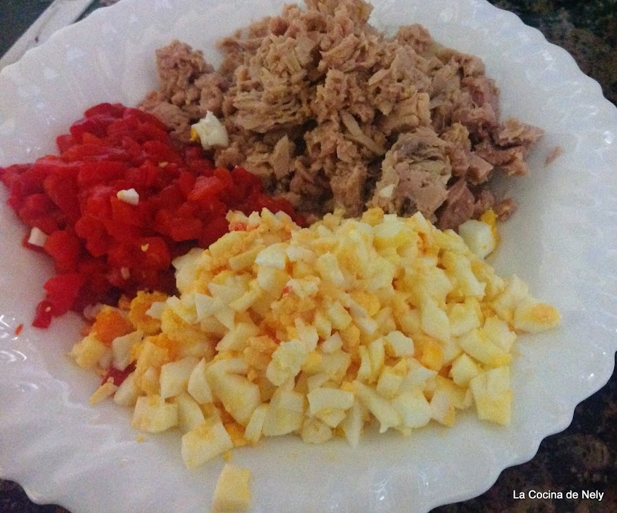 Se pican los pimientos, y los huevos bien pequeño, se mezcla con el bonito y el tomate.