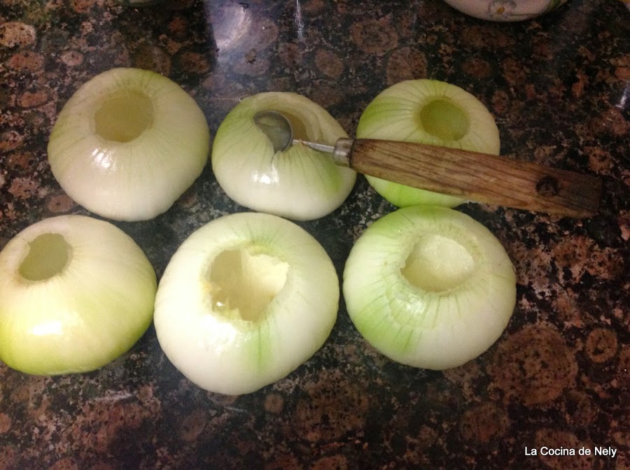 Ahuecamos las cebollas con un saca bocados que es lo que veis en la foto o con una cuchara pequeña, deben quitarse la mayor parte de cebolla , pero con cuidado de no romperlas.