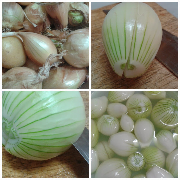 Yo usé unos 700g de cebollitas peladas, pero la cantidad no importa, solo importa que queden cubiertas de líquido.