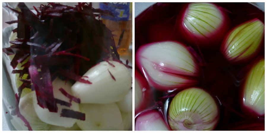 Por internet no encontré demasiado, parece ser que es menos común de lo que yo pensaba... deberían ser reconocidas a nivel mundial! El caso es que con lo que pillé leyendo por ahí de los encurtidos y lo que me dijo mi madre y mi parte de inventiva porque no tenía ni idea de cuándo ni cómo poner la remolacha, al final me han salido unas cebollitas que madre mía, con deciros que casi no nos quedan y ya tengo preparadas más cebollas para hacerlas...