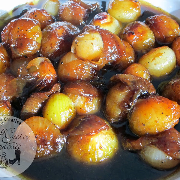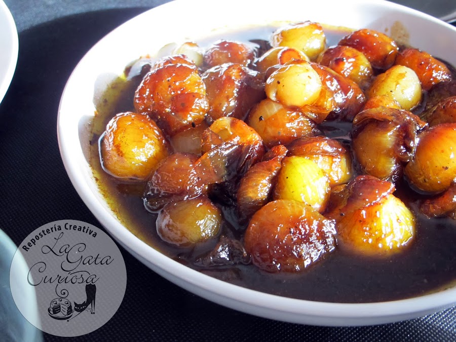 En los días próximos subiré el resto de guarniciones y La Pularda Rellena, pero he querido dejar solas las cebollitas glaseadas porque creo que se merecen sitio para ellas solas.