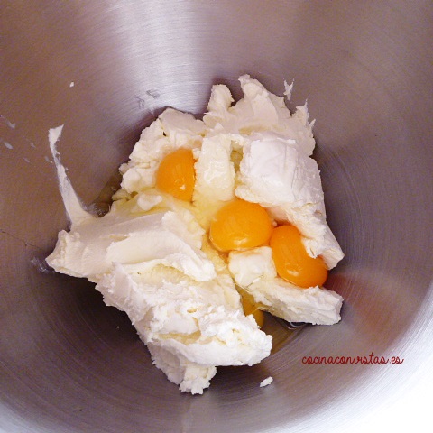 En el bol de la amasadora ponemos el queso, la nata (crema de leche), el interior de la vaina de vainilla, el azúcar y los 3 huevos más las 2 yemas,