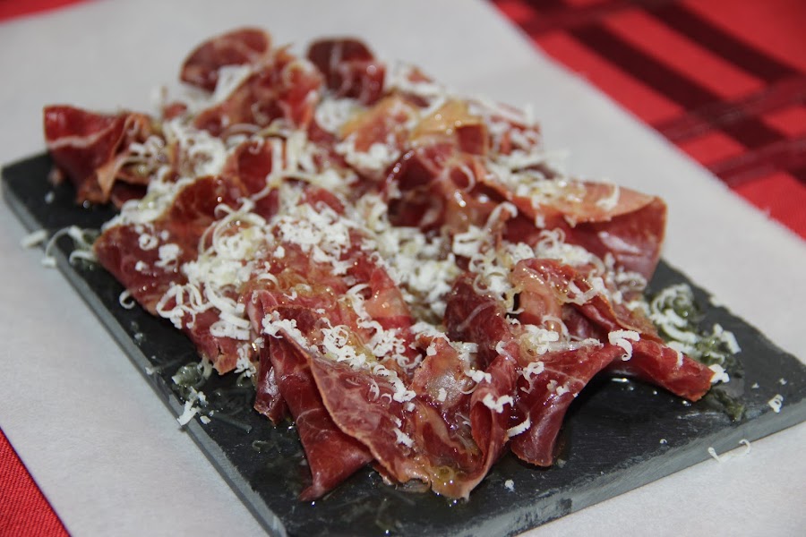 Poner la cecina en un plato, rallar bien de parmesano y echar un chorro de aceite por encima.
