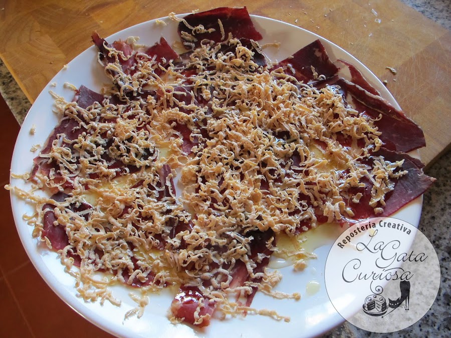 Quitamos a las lonchas cecina los bordes y la hacemos tiras no excesivamente grandes, las disponemos en el plato de manera ordenada.
