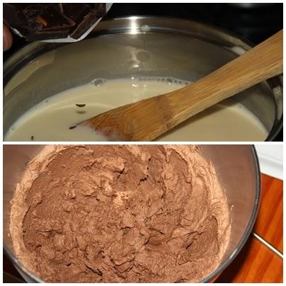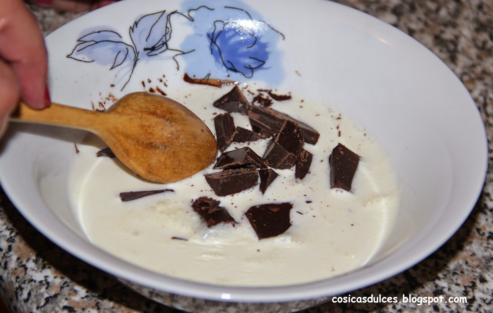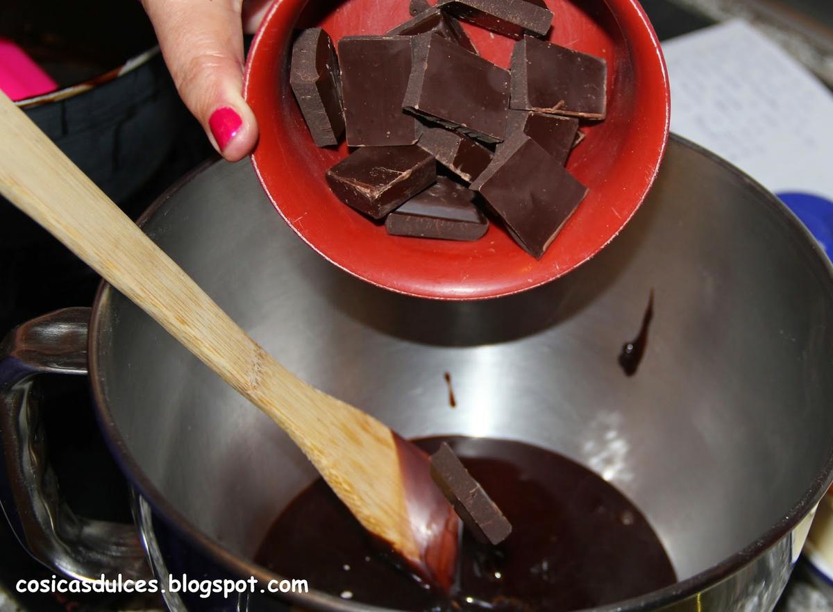 Por último sólo nos queda preparar la ganache de cobertura. Calentamos bien la nata (crema de leche) sin que llegue a hervir. En ese punto la retiramos del fuego e incorporamos el chocolate troceado removiendo bien hasta obtener una crema brillante.