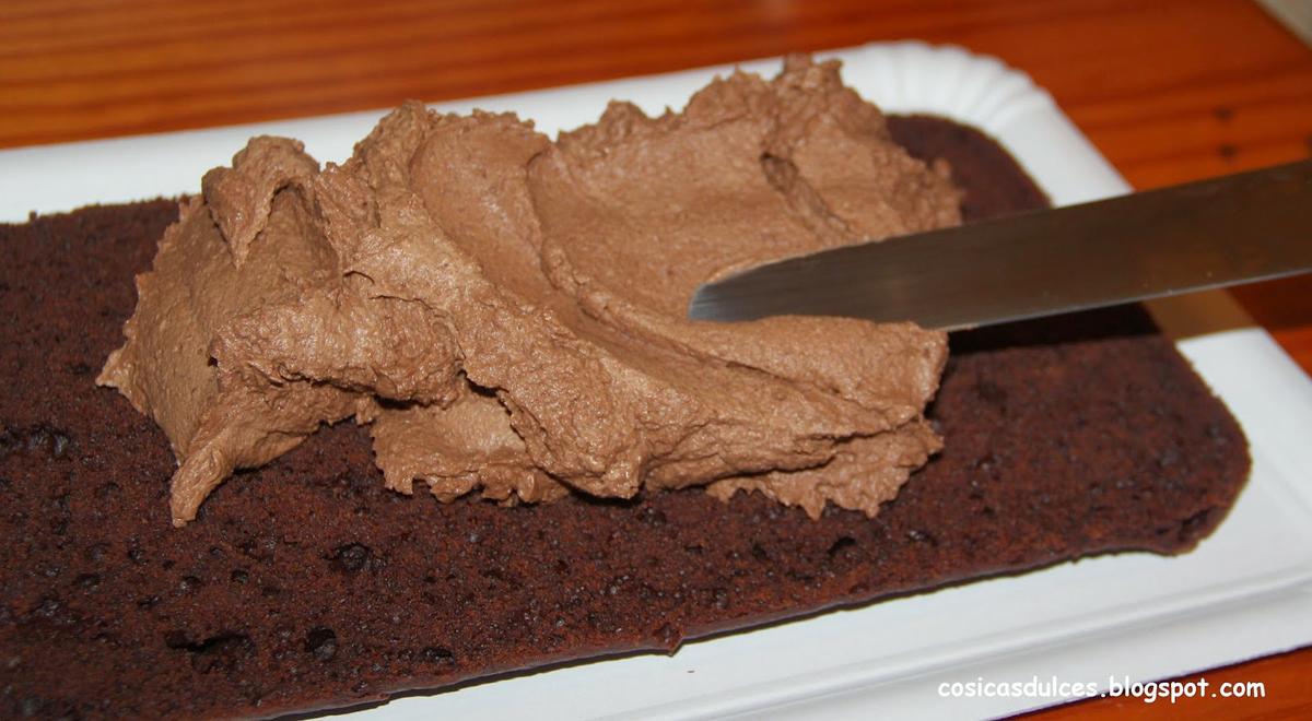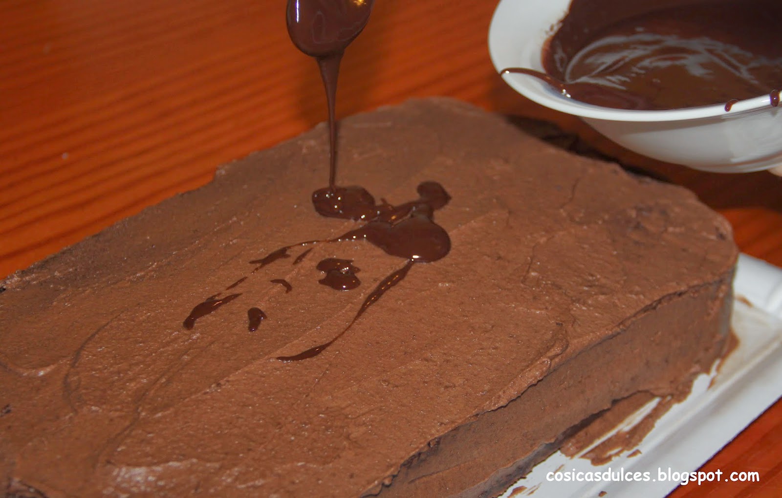 Una vez bien rellena, la tapamos con la segunda lámina de bizcocho. Recubrimos con una capita muy fina de la trufa reservada y añadimos la capa de ganache. Es importante que el ganache esté templado ya que si lo vertemos caliente fundiría la trufa.