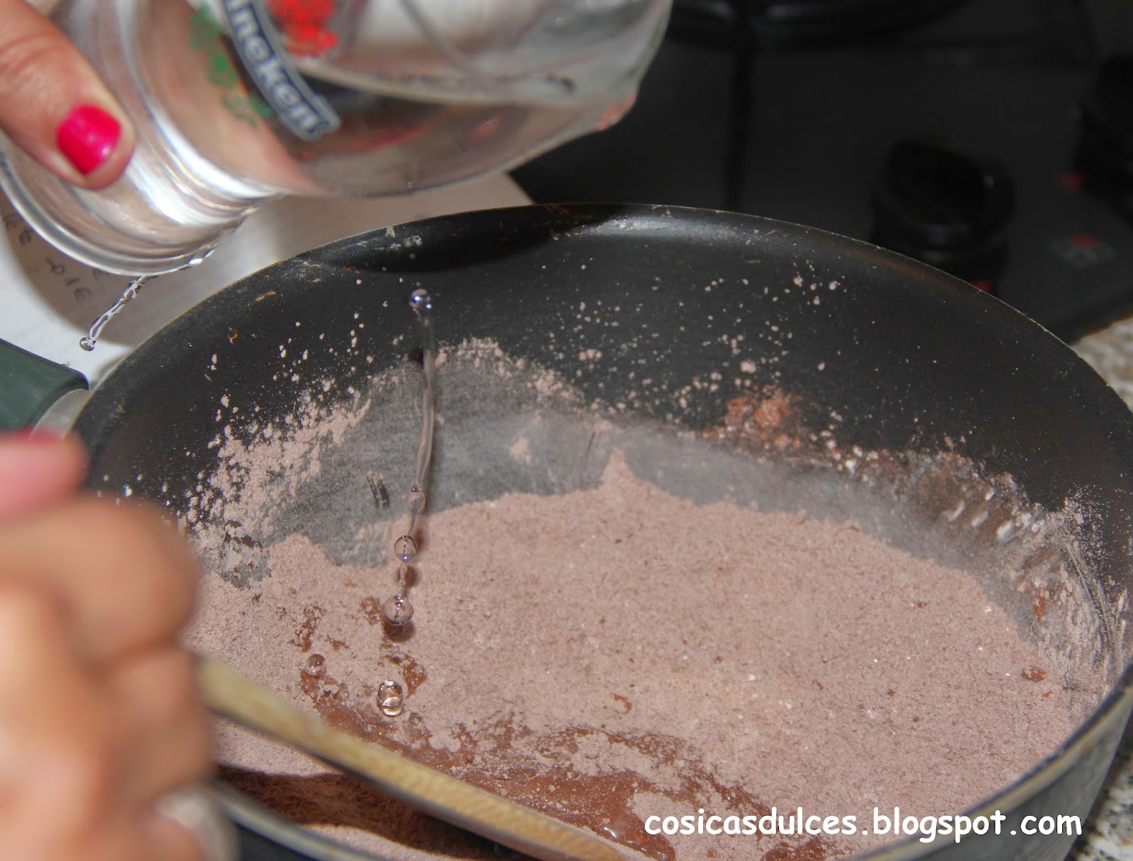 Comenzamos por preparar el bizcocho. Para ello ponemos en un cazo la maicena, el azúcar moreno, el azúcar blanquilla y el agua. Mezclamos bien y mantenemos a fuego suave sin dejar de mover hasta obtener una crema espesa y homogenea.