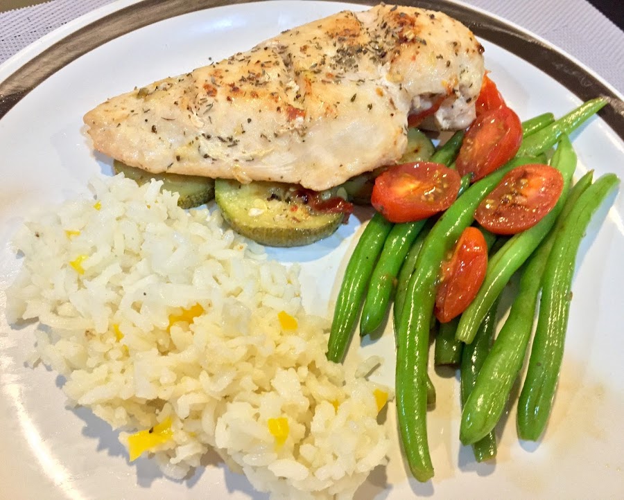 1.- Colocamos las pechugas de pollo sobre una cama de rodajas de calabacitas y tomates.