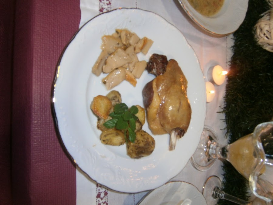 Jamoncitos de pato con patatas panaderas y Bolletus: Los jamoncitos de pato vienen enlatados y listos ya para servir (Club del Gourmet de El Corte Inglés), un bote de rodajas de Bolletus (Club del Gourmet de El Corte Inglés), ocho patatas, una cebolla, 50g de mantequilla, agua, sal, pimienta y perejil. Pelamos las patatas y las cortamos en rodajas de buen grosor, sal/pimentamos las patatas, cortamos la cebolla en juliana y la sofreimos con la mitad de la mantequilla. Ponemos las patatas, la cebolla, la mantequilla y agua hasta cubrir las patatas en un recipiente de horno. Horneamos 30 minutos a 180ºC . Emplatamos los jamoncitos,previamente calentados en el horno, una cucharada de rodajas de Bolletus y una cucharada de patatas panadera.