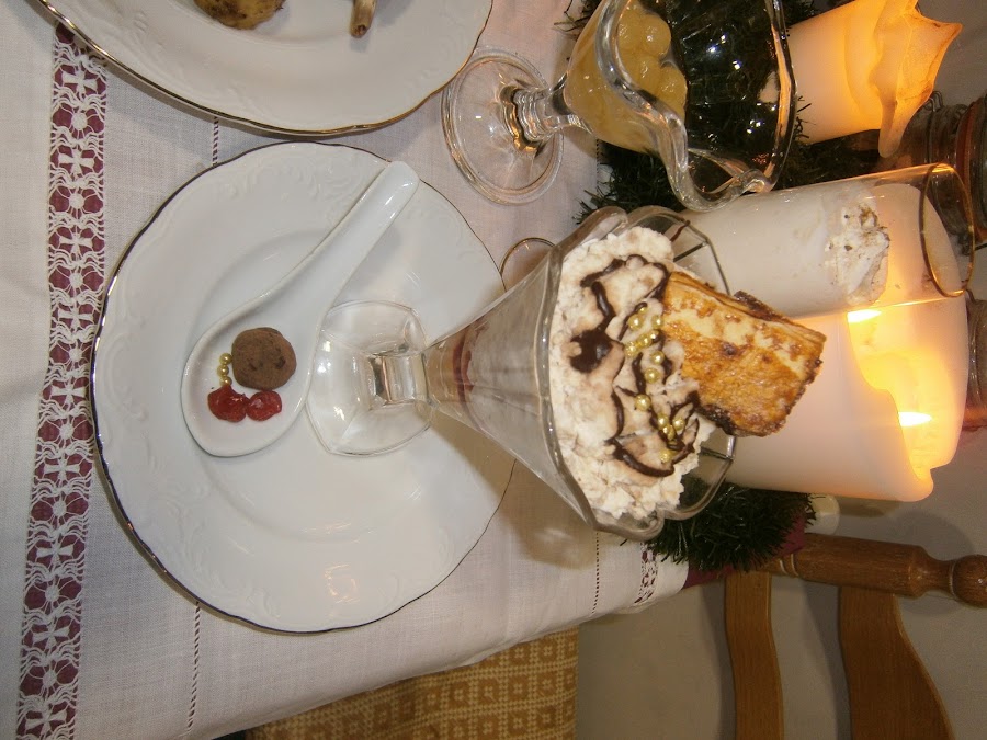 Mousse de Polvorón y Alfajor: tres polvorones, tres Alfajores, 600g de nata (crema de leche), azúcar glass. Montamos la nata (crema de leche). Incorporamos el azúcar glass y los polvorones y alfajores machacados (que se hagan polvo). Removemos con una espátula hasta que quede bien mezclado. Decoramos a gusto, yo en una copa he puesto una base de turrón de Jijona (turrón blando), una trufa de chocolate, un poco de sirope de fresa y luego la mousse. y por encima de la mousse unas bolitas doradas, un raviolli de chocolate (hecho por mí con la masa quebrada que me sobraba y una onza de chocolate) y un poco de sirope de chocolate.