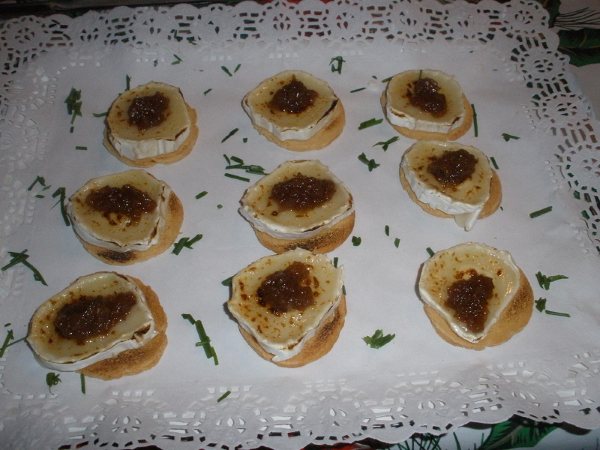 - tostaditas de rulo de cabra fundido con soplete con cebolla carameizada.