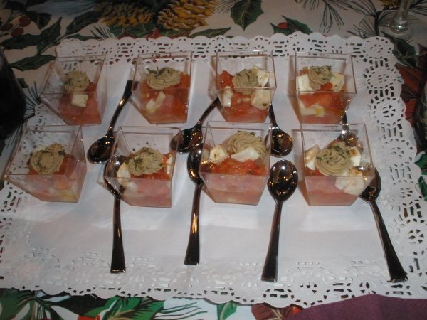 -vasitos con ensalada de tomate y queso de cabra, aliñada con vinagreta de ajo y oregano, coronada con pudin de anchoa.