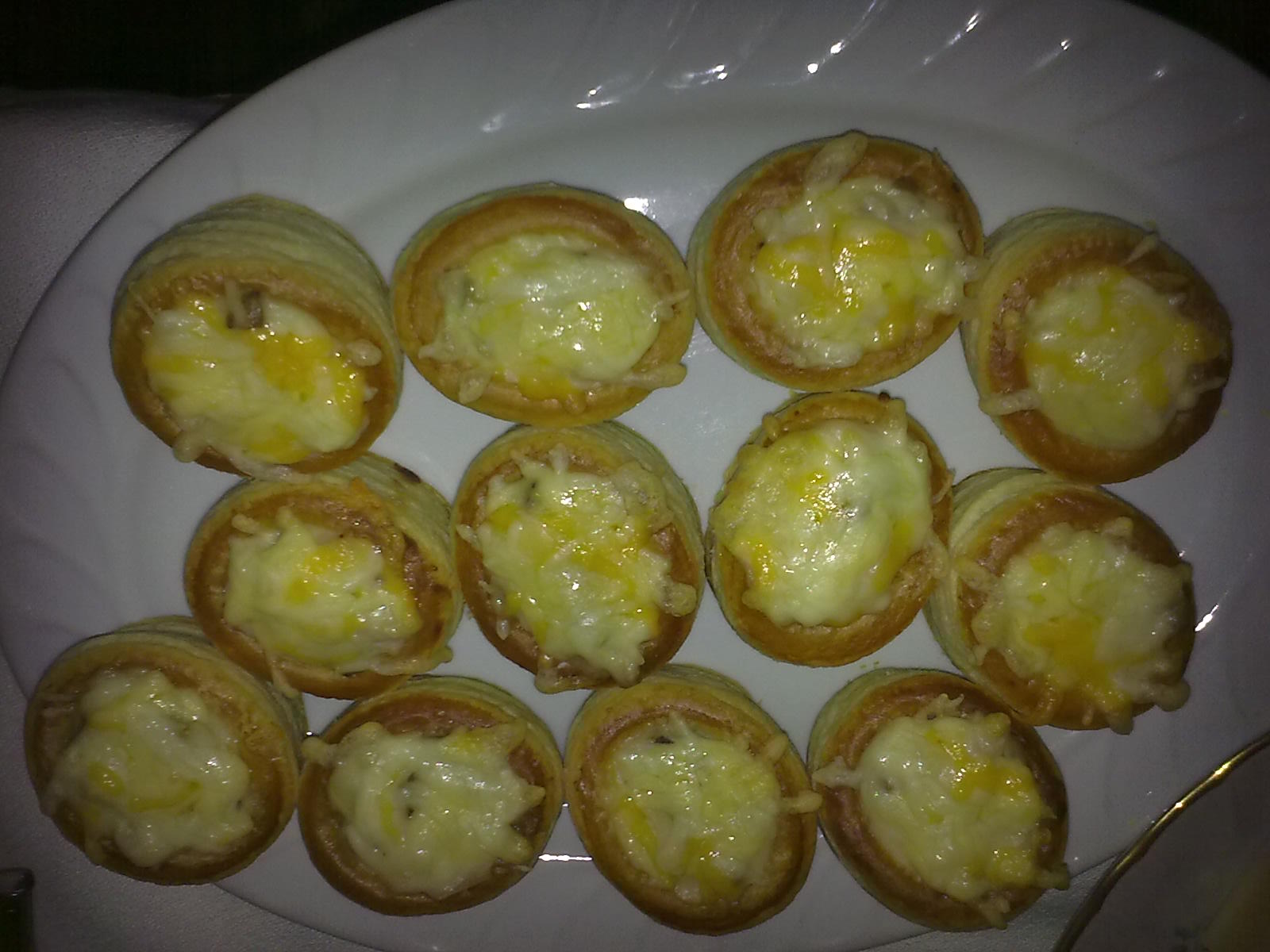 TARTALETAS CON CEBOLLA CARAMELIZADA , BECHAMEL Y QUESO