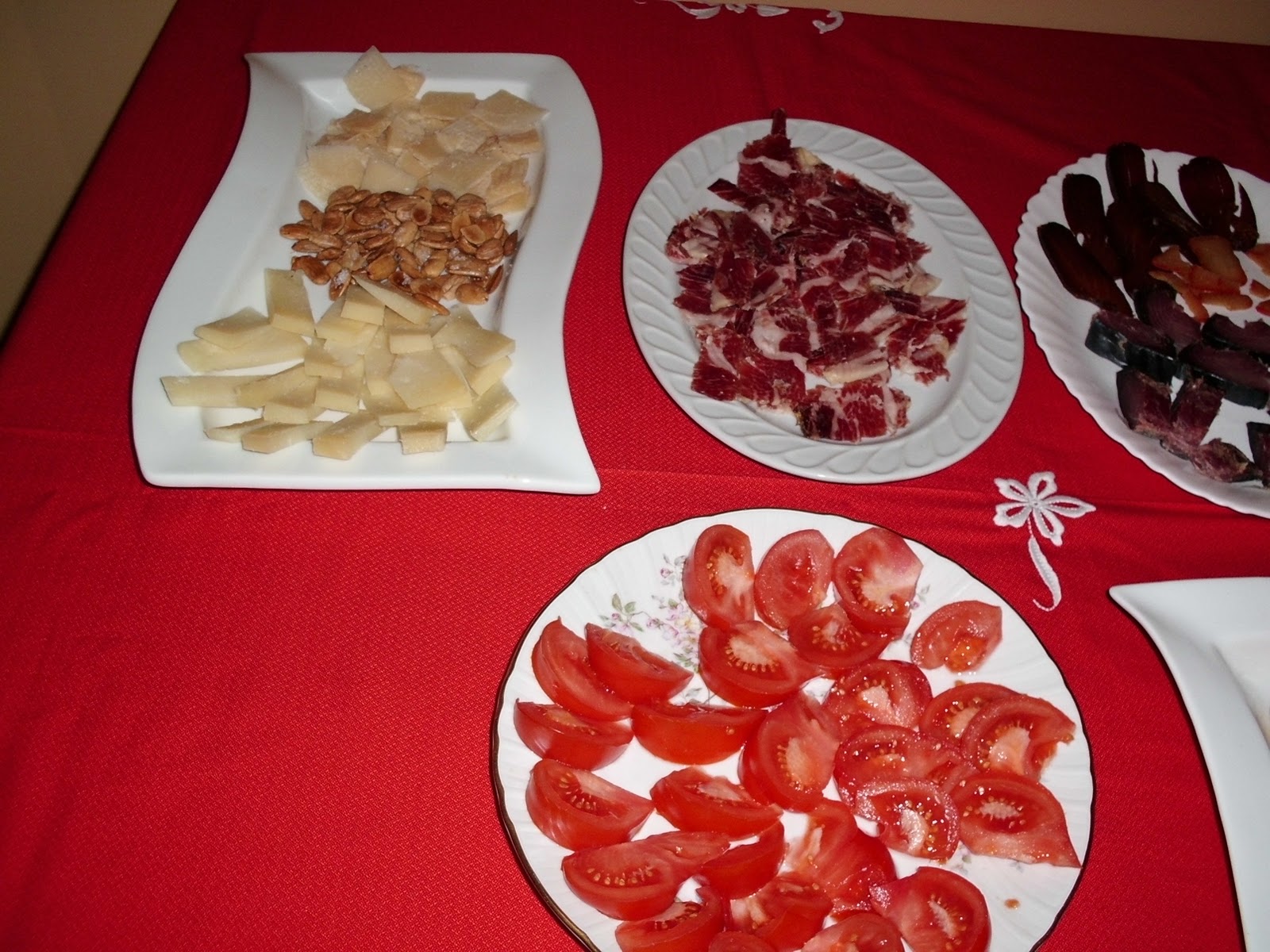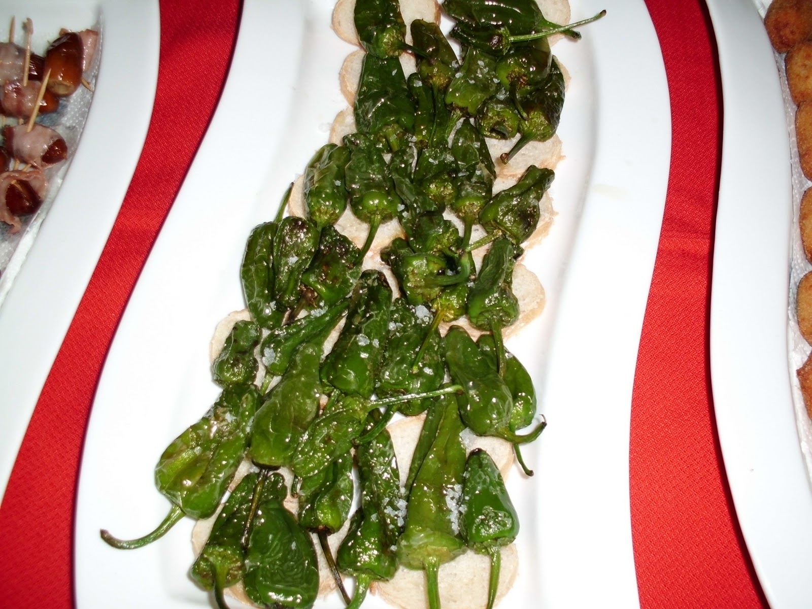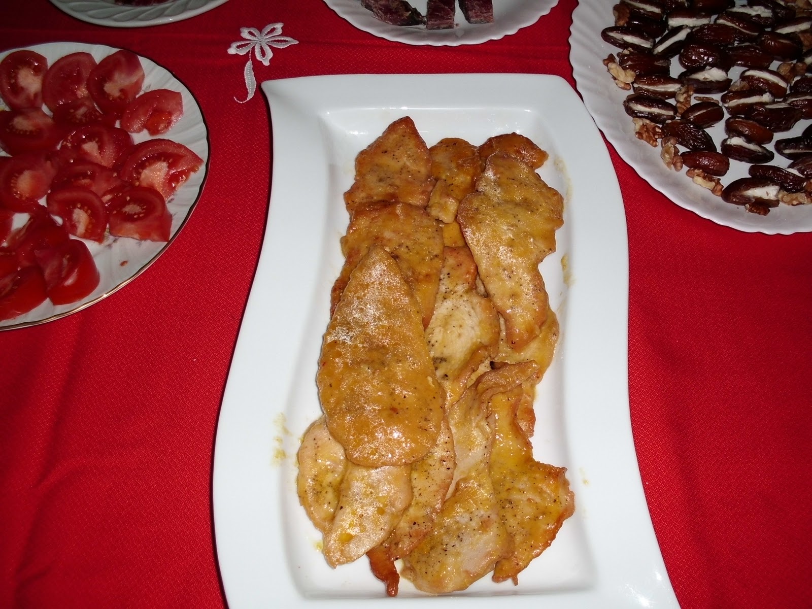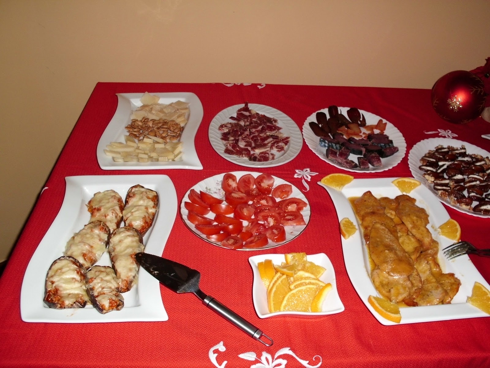 DATILES CON BEICON PECHUGAS DE POLLO A LA NARANJA PIMIENTOS DE PADRON FRITOS CROQUETAS DE POLLO CREMA DE CALABAZA PATATAS PANADERA BERENJENAS RELLENAS DE POLLO CHULETAS DE CARBRITO A LA PLANCHA QUESO PARMESANO,JAMON IBERICO Y LOS POSTRES DELICIA DE NARANJA Y CHOCOLATE TARTA DE MANZANA