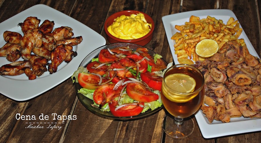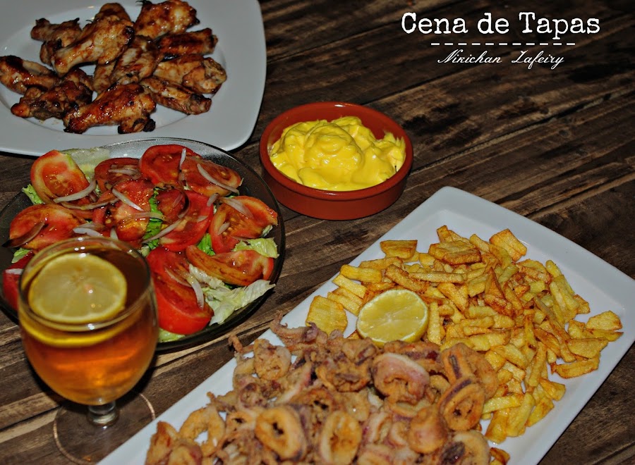 Actualmente han llegado hasta los banquetes de recepción, a los más altos dignatarios en los denominados "tapas meeting". Al igual que la variedad en tapas esta su precio, porque hoy en día ya hay alta cocina en miniatura. Nosotros vamos a tirar por lo económico y abundante... directamente nos vamos a dar un gustazo con unas buenas raciones. Ideales para cualquier cena informal con amigos o un día de deportes televisados para los más forofos. ¿Quién no disfruta de unas alitas de pollo al horno y chipirones fritos aun que no le guste el fútbol? Vamos con la receta!