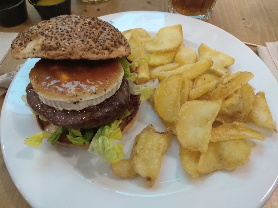 Como veis en la foto,la hamburguesa es de un dedo o dedo y media de gruesa.En este caso mi hijo la pidio solo con queso pero la sirven con tomate y lechuga,bueno y si la quieres pedir con mas cosas tambien puedes pero para cenar se veia demasiado con mas complementos la verdad.Era de un tamaño bastante bien y acabo llenisimo! Ademas,despues le puso su mayonesa, su kepchuy el monton de patatas que le pusieron porque el plato era grande eh!Estaba muy buena la verdad.