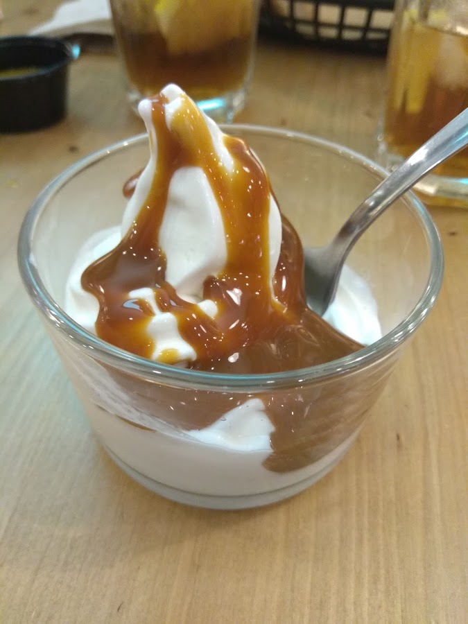 Bueno....y como broche final y ya para salir rodando del restaurante nos pedimos un postrecillo.Todos nos pedimos el helado de yogurt pero cada uno con un topping diferente.Mi marido lo pidio con chocolate blanco, mi hija pequeña se lo pidio con chocolate negro y yo y mi hijo mayor nos lo pedimos con dulce de leche....es un vicio la verdad el dulce de leche(y muy muy calorico....pero bueno no se come todos los dias)