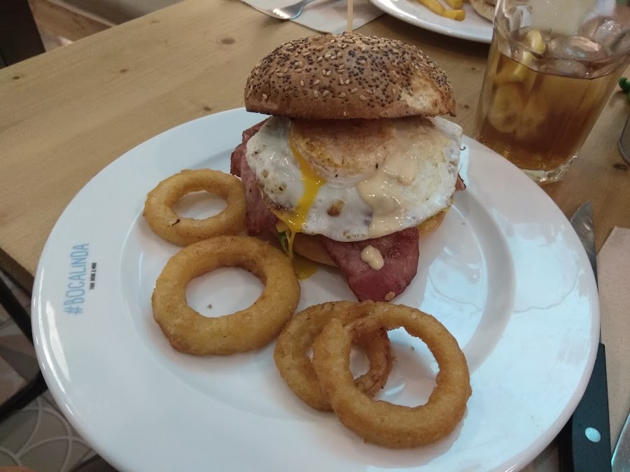 Ahora veremos la hamburguesa que se pidio mi marido.Era bastante completa pues constaba de la hamburguesa de ternera,bacon,lechuga,tomate,queso y huevo....vamos para darle un bocado a la hamburguesa habia que abrir la boca muchisimo jajajaja.Esta hamburguesa la pedias con un menu que entraba la hamburguesa, la bebida,el postre y el cafe. Por un poco mas te ponian un complemento, que el se pidio los aros de cebolla.Acabo tambien bastante lleno la verdad pues ya os digo que son hamburguesas grandes y muy buenas.