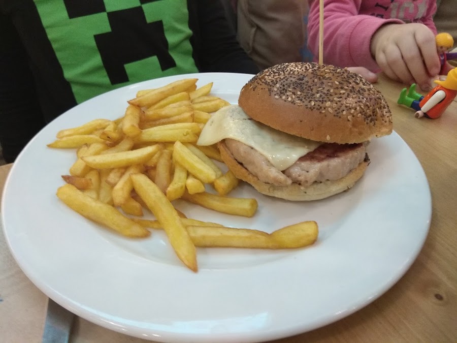 El peque mayor se pidio un menu infantil con hamburguesa de pollo y patatas,que riete tu de las hambueguesas de los sitios de comida rapida! Esta si era una hamburguesa de verdad!!!