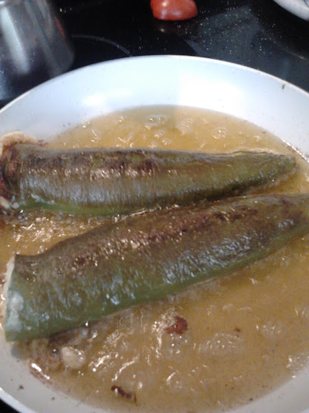 Pondré algunas fotos del proceso. Freír la patata para tortilla, se mezcla con el huevo y se rellenan los pimientos