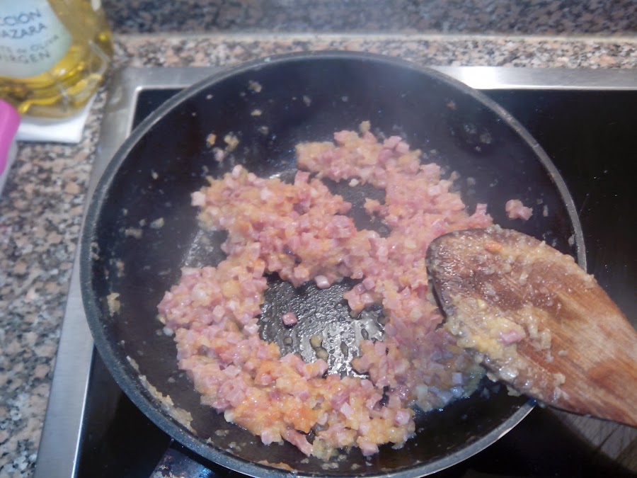 Pochamos en una sartén con cuatro cucharadas soperas de aceite la cebolla muy picada y el tomate pelado y picado en trozos. Cuando el tomate esté desecho y la cebolla pochada añadimos el jamón serrano muy picado, removemos la mezcla y lo dejamos cocinar durante 3 o 4 minutos.