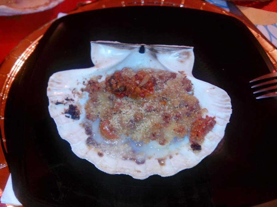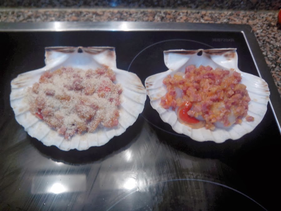 Abrimos y limpiamos las vieiras y les añadimos una cucharada del mejunje, las cubrimos con pan rallado y las metemos en el horno a gratinar. Cuando estén doradas las retiramos del horno y listo para comer.