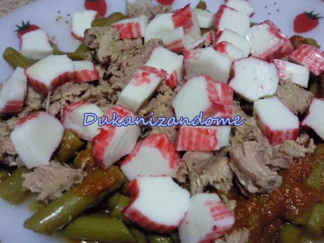 Escurrimos las habichuelas y ponemos en el fondo del plato, encima añadimos 2 cucharas soperas de tomate frito dukan y extendemos con la cuchara sobre ellas. Desmenuzamos el atún y encima de este las rodajas de surimis troceado. En un vasito ponemos un chorrin de vinagre, un poco sal, pimienta molida y 1 cucharilla de café de salsa de soja, batimos con un tenedor y añadimos por encima de la ensalada.