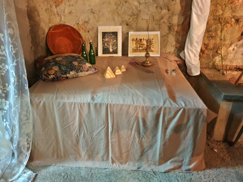 Rincón de una casa egipcia con sus papiros, cojines, etc