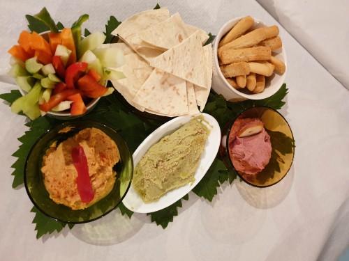 Acompañado de crudités, pan de pita y saladitos... a gusto del consumidor...