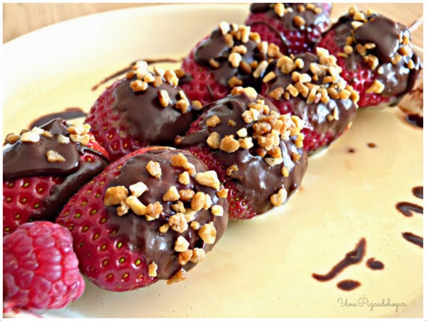 Estas brochetas de fresa y frambuesas con chocolate y base de natillas que nos enseñan a hacer Maribel de Una pizca de hogar.