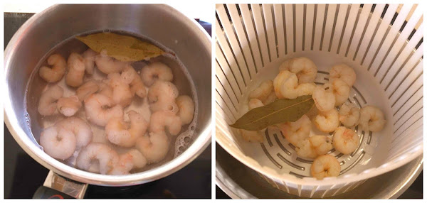3. En una cazuela con un poco de agua poner a cocer las gambas unos 5 minutos con una hoja de laurel.