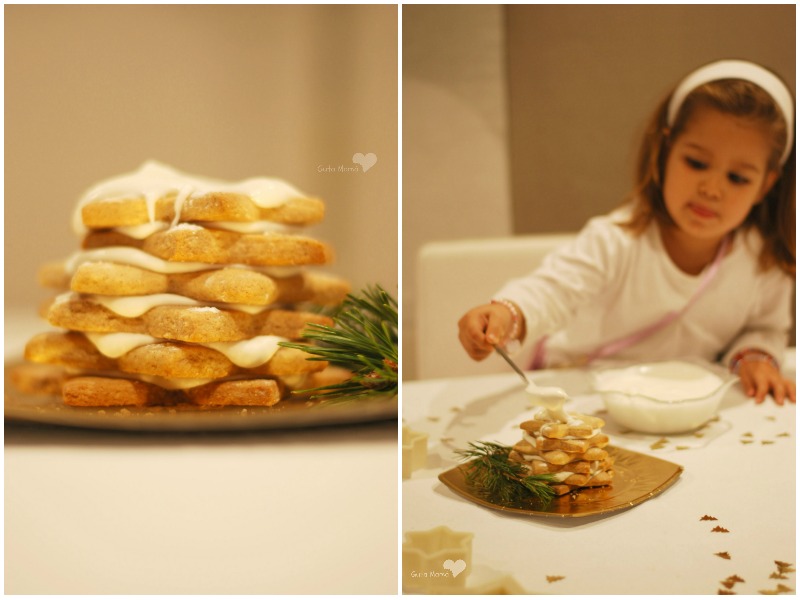 Ponemos en la bandeja donde vamos a presentar el árbol un poco de glasa real para que actúe como pegamento y situamos encima la primera galleta.