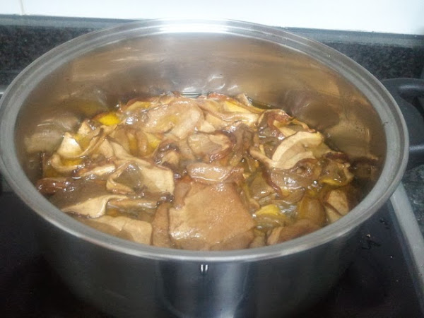 Luego los escurrimos bien de agua. Por cierto este agua la podemos utilizar en alguna otra elaboración como por ejemplo como caldo en un rissoto ya que tiene todo el sabor de los ceps.