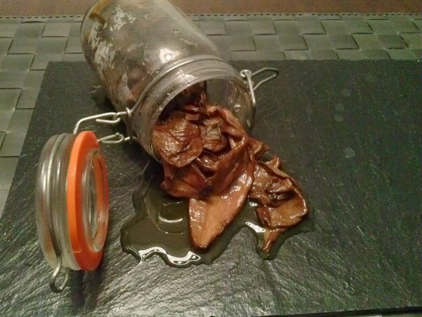 Después confitaremos los ceps durante veinte o veinticinco minutos a una temperatura no superior a 80 º C. Dejamos enfriar y los pasamos a un bote de vidrio junto con el aceite , tapamos y conservamos en nevera hasta su uso.