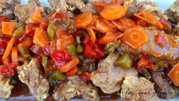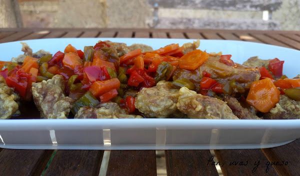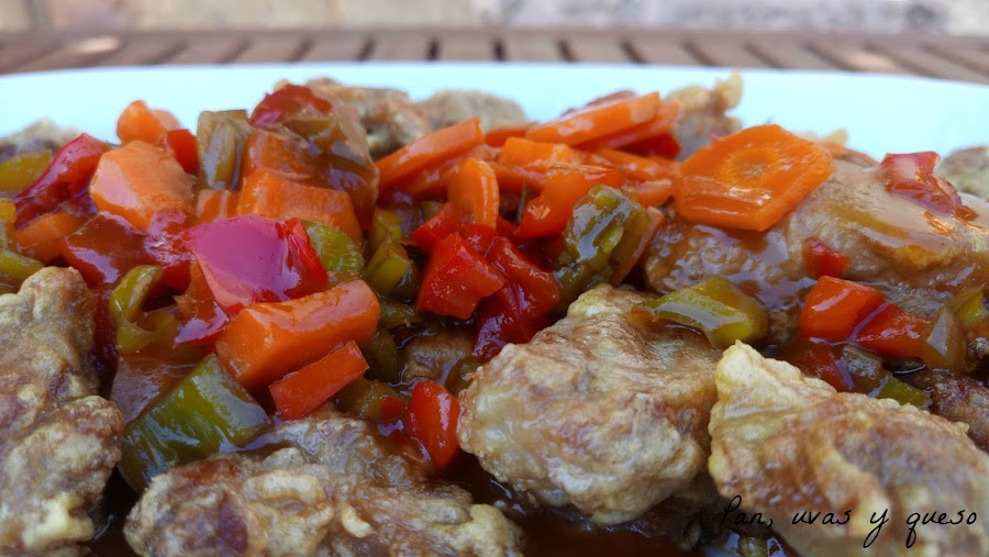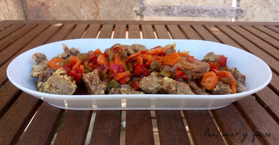 A la hora de servir el plato, colocamos la carne en una fuente y la cubrimos con la salsa.