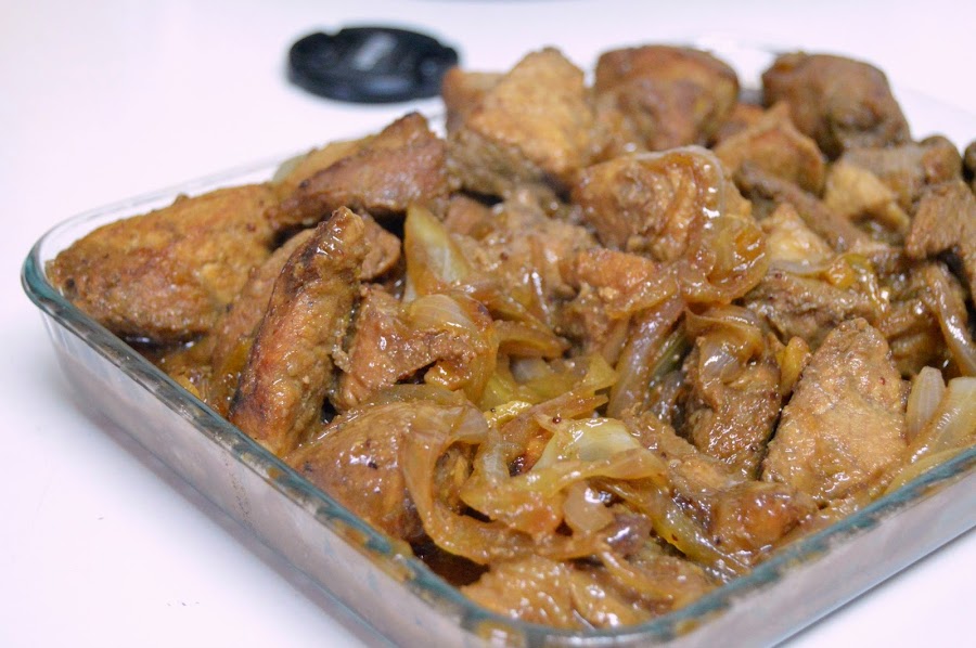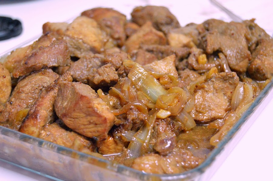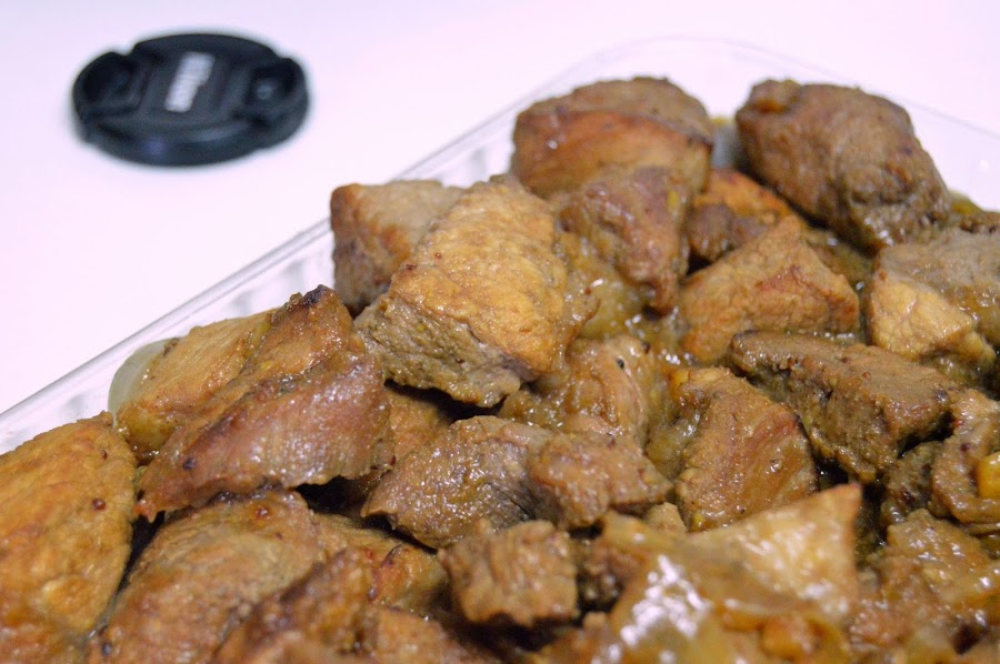 Colar la carne y reservar el marinado. Dorarla en una olla con 2 cucharadas de aceite. Salpimentar. No os paséis con la cocción pues quedaría muy dura. Añadir la marinada, mezclarla bien y dejar que se reduzca y apagar.