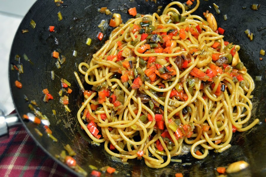 Simples como saltear los espaguetis cocidos con todo tipo de verduras cortadas y salteadas previamente y al final añadiéndole un buen chorro de soja y dándole un par de vueltas.