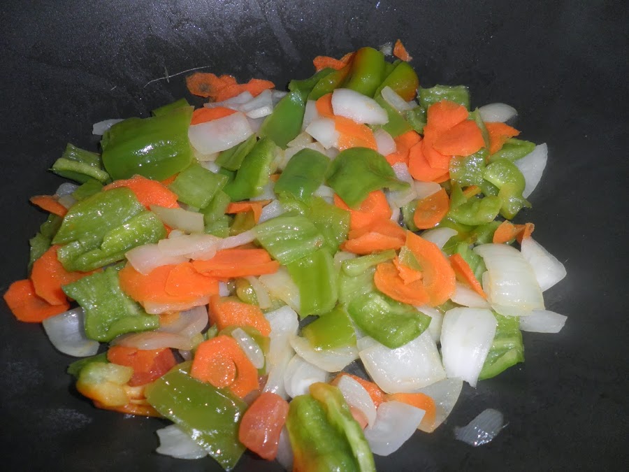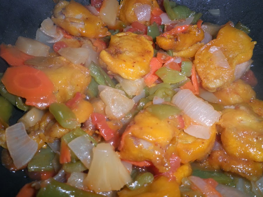 Poner a pochar primero la verdura, pero no demasiado. Cuando esté, agregar la piña y la salsa agridulce.?