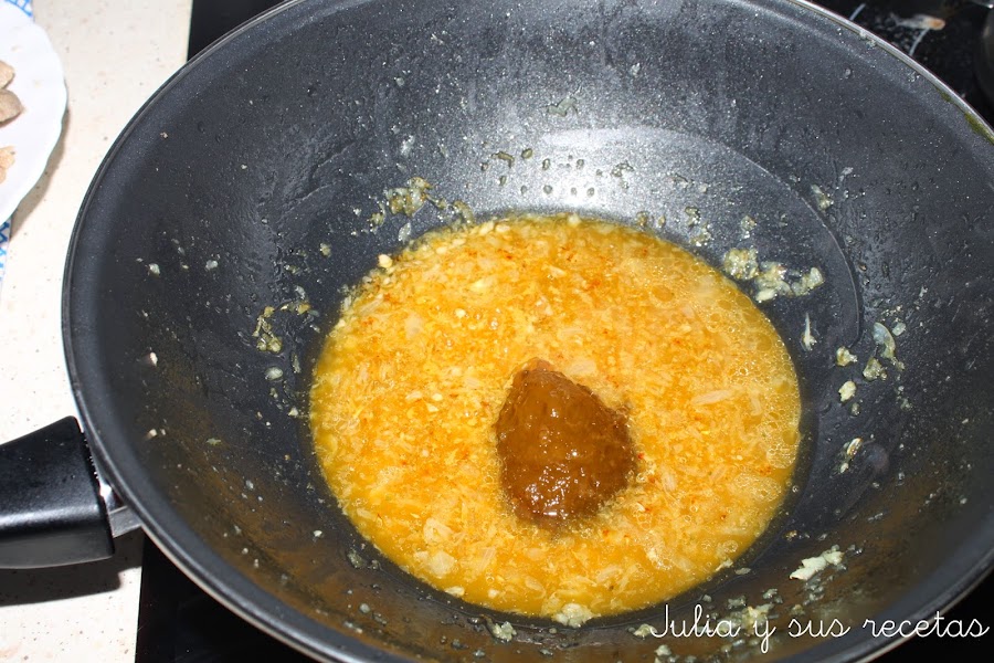 Cuando estén sofritos añadimos el caldo, el curry, el jengibre y la mermelada.