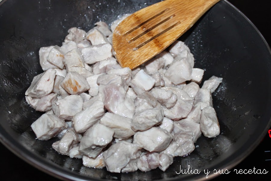Ponemos el aceite en el wok o sarten y cuando esté caliente sofreímos la carne. La retiramos y reservamos.