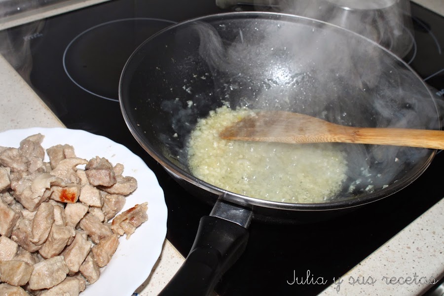 En el aceite restante sofreímos la cebolla y los ajos muy picaditos.