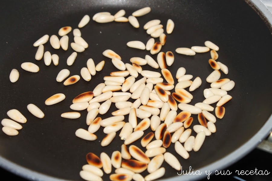 Tostamos los piñones en una sartén. Los reservamos.