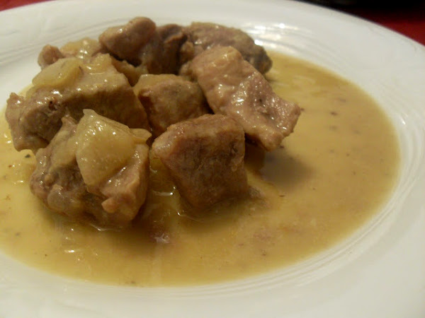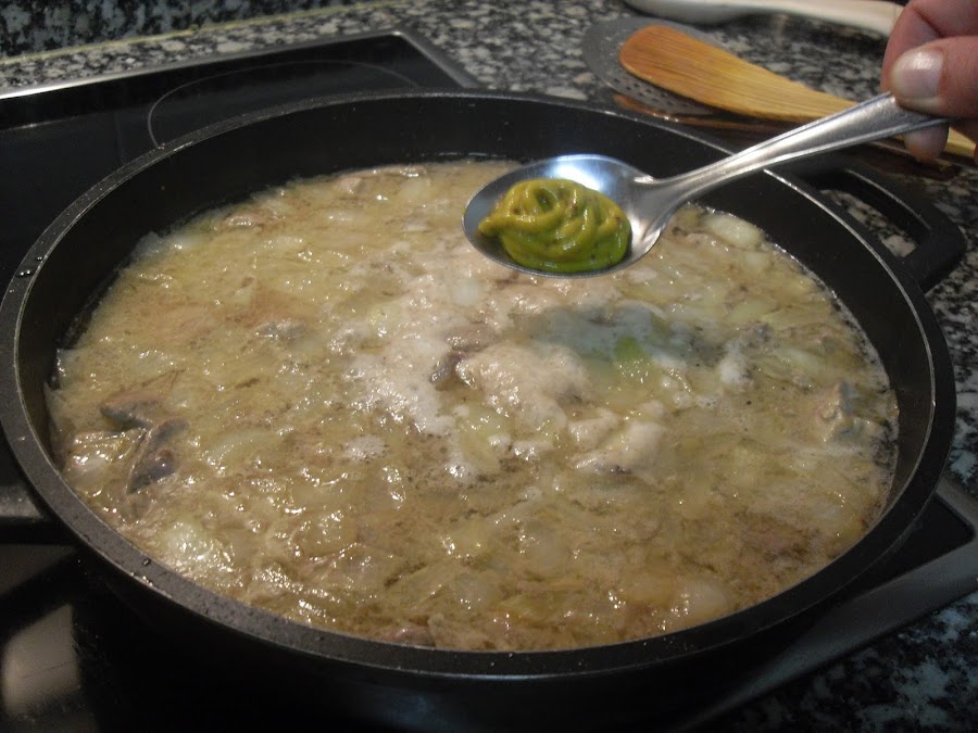 Ahora ya preparamos la salsa añadiendo a la carne el vino blanco, dar unas vueltas y dejar evaporar un par de minutos, seguidamente añadir el caldo, toda la nata (crema de leche) vegetal sin lactosa, las dos cucharadas de mostaza y dejar cocer a fuego lento unos 30 minutos, hasta que la salsa reduzca su volumen.