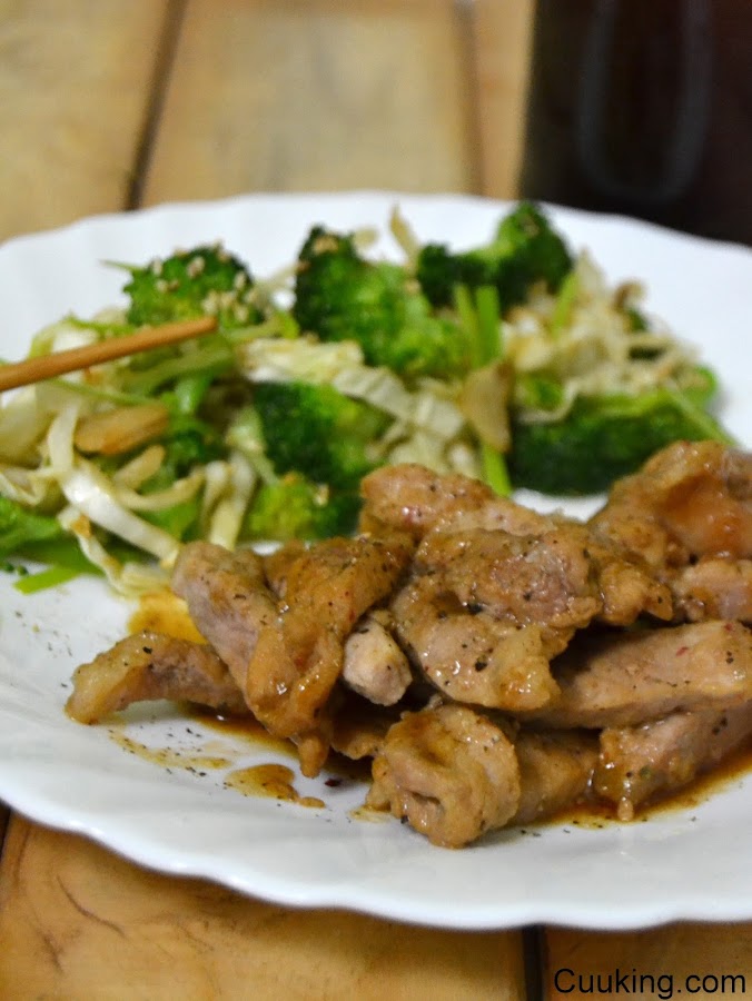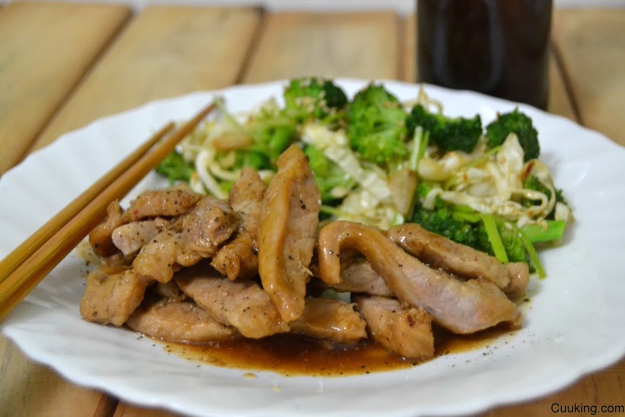 1.- Cortamos los filetes de cerdo en tiras y los ponemos a macerar con la salsa de soja, la de teriyaki, sal, 5 pimientas molidas y el aceite se sésamo. Dejamos macerar mínimo 1 hora. Lo mejor es dejarlo de un día para otro.
