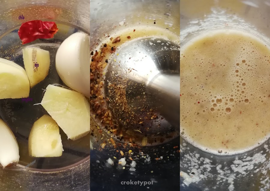 Triturar el jengibre, el ajo, los chiles y el vinagre de vino blanco hasta formar una pasta.