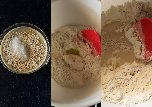 En un bol o en una tabla ponemos la harina con un hueco en el centro, añadimos la levadura, el yogurt, el aceite y amasamos 10 minutos, la dejamos tapada, en un lugar cálido, con un trapo húmedo una hora mínimo hasta que doble el tamaño.