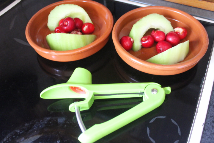 Con el aparato que veis en la foto, se sacan los huesos de las cerezas fácilmente, si no tenéis el aparatito, podéis dejar las cerezas con hueso o partirlas por la mitad con un cuchillo afilado y quitarles el hueso manualmente.