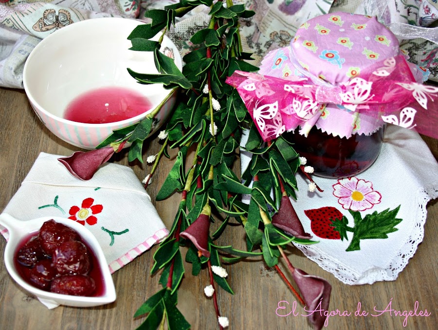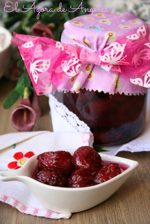 No soporto las cerezas en almíbar pero me bastó ver que se podían hacer ,más o menos en casa, para ponerme a ello.No se tarda nada de nada y el resultado no es , ni con mucho, empalagoso como las que se compran.