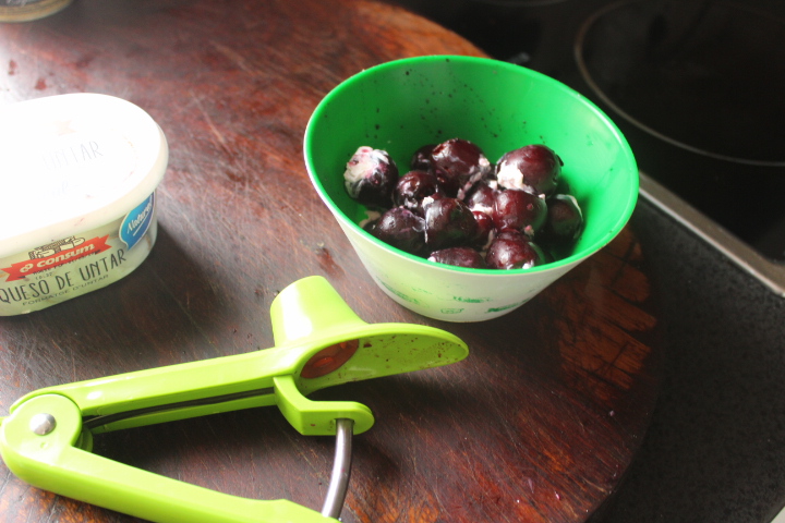 También, si no tenéis el aparato verde, con la ayuda un cuchillo podéis partir por la mitad las cerezas, retirarles la semilla y posteriormente unir sus mitades con el queso.