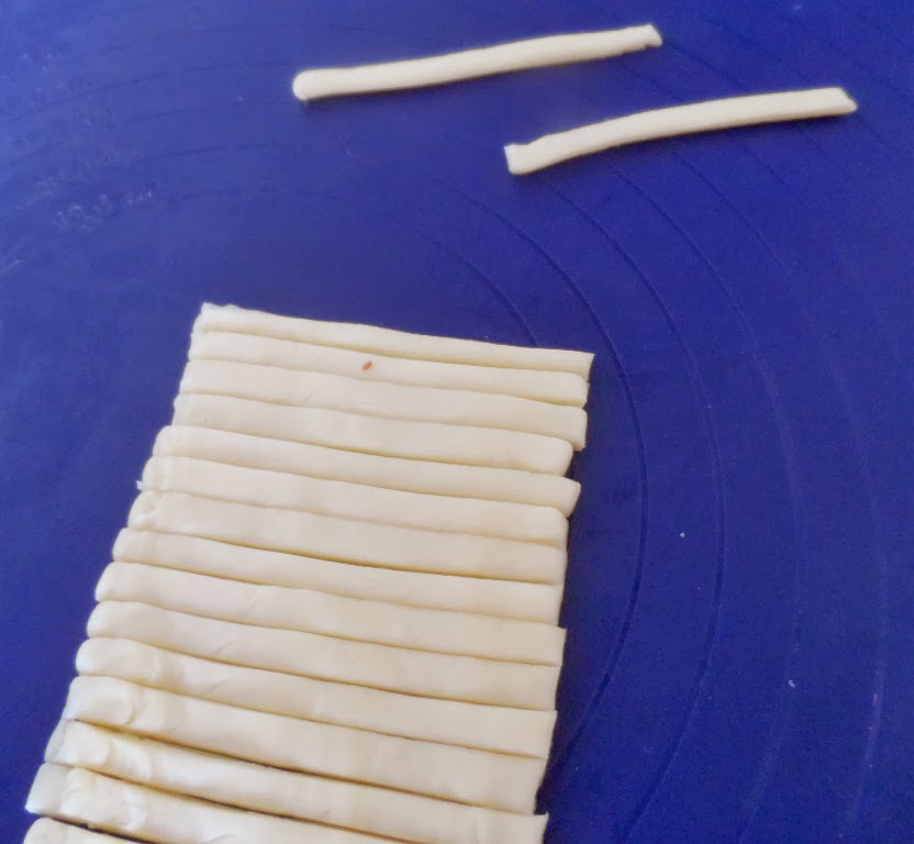 Cortamos tiras de masa brisa de ½ a 1 cm de ancho, unos 7cm de largo y un grosor de ½ cm aproximadamente.